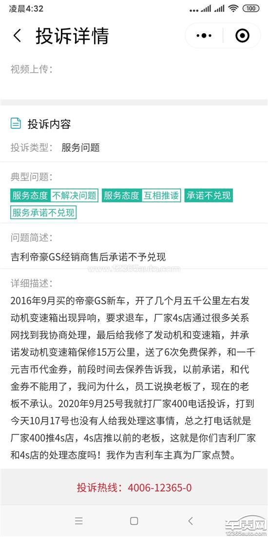 投诉编号:【540864】 投诉时间:2020-11-07 04:49 投诉品牌:吉利汽车 投诉车系:帝豪GS 投诉车型:2016款 1.8L 自动 领尚型 优雅版