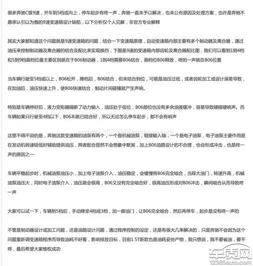 本人18年8月购入的18款奔驰C200L车型,3500km时出现起步变速箱异响问题,发生条件为车辆挡位升至5挡车速达到50公里每小时后,匀速刹停车辆,车辆挡位为2挡再重新起步,车辆中前部(也就是变速箱位置)传来“咚”一样的机械碰撞声并且每次都稳定无限重复出现。经过与奔驰厂家和4s多次交涉,对方认为这是正常工作声音,不影响行车安全,而且不影响使用寿命。并且没有任何数据证明长年累月的金属撞击不会造成变速箱损坏。我看到从17年年底,网络上不断有人遇到同样的问题断定大面积车主的车都有同样问题,但是奔驰至今没有给消费者一个公开的安全声明。我先后跑了3家经销商,所有的销售经理都表示对这个异响并不知情,表示很惊讶。我认为奔驰存在故意隐瞒客户的行为。下图第一张是奔驰厂家给出的监测说明,完全就是糊弄了事,竟然说完全不用在意响声,难道要捂着耳朵开车的么?附带的视频是在安全路段路试录制的异响视频。我需要一个满意的处理方案。要么换车,要么换变速箱解决异响问题。
