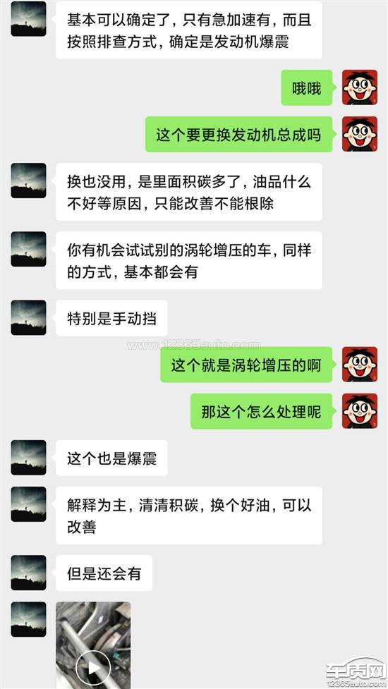 加油门到1000--1500转速的时候就刺啦刺啦的响,声音超大!去4S店检查了好几次都找不到原因,那我新车回来怎么会没有这响声!有好几个车友说他的也是这个问题,去他当地的4S店给他换了飞轮就好了!我这里去检查就说正常,最近越来越响我又去4S店检查,这次检查出来原因了,说是飞轮有问题,索赔的师傅说给我订货,让我回家等货到了过来跟换,第二天4S店师傅又打电话给我,说厂家让我来再复查一下!我又去了4S店,师傅仔仔细细的检查,听诊器仔细听,还是确定飞轮问题!现在厂家说是爆震,找各种理由就是不同意跟换!你一个视频就能确定是爆震,4S店那些师傅那么仔仔细细检查出来的问题,你一个视频就能判断,那些师傅辛苦检查出来的结果都是白费力气吗?希望厂家尽快帮我解决!每次投诉都说厂家处理,从投诉到现在没有接到厂家和4S店一个电话!这样的厂家真让人心寒。