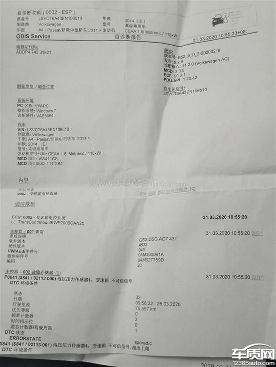 上汽大众帕萨特变速箱机电控制单元故障2020-12-06车型:2016款 330TSI DSG 御尊版