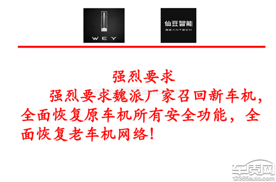 车机于2020年:7月30日下单,9月份安装重新一系列的问题异常:1.黑屏,死机重启,(升级)2,音响变成垃圾音响质3,信号问题非常大,山区就没信号4,反应还不如原来的车机反应快5,升级车机原有的:原车车机带T-BOX电池和喇叭,新车机没有T-BOX电池尝试过没有通电情况下无法使用(无反应)备用电池的重要性:救命假如出现车祸后,汽车电瓶不能工作,该电池可以保障我们的汽车应急通讯,也就是魏派汽车宣传的紧急救援功能,触发紧急救援呼叫后,救援中心将第一时间进行救援!备用电池可以协助定位汽车位置新车机出现重大安全缺陷新车机在汽车关闭发动机后,紧急救援按钮立即断电,该功能无法使用!新车机已经改变了魏派汽车紧急救援设计初衷,已经无法实现紧急救援功能!车主生命安全无法保障!车主们是看到“完美适配原车协议,准前装级服务体验”才进行升级智能车机!车主们需要的不是减配,不是漏洞BUG强烈要求强烈要求魏派厂家召回新车机,全面恢复原车机所有安全功能,全面恢复老车机网络!