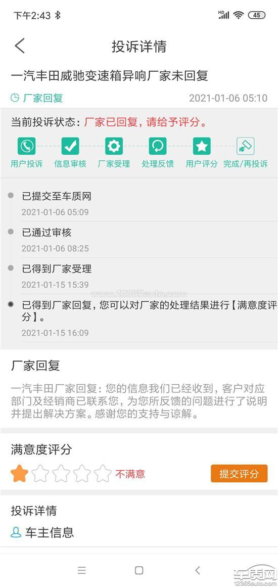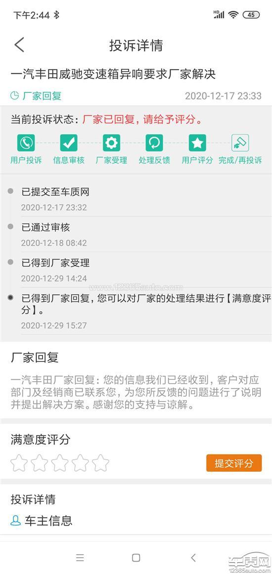 一汽丰田厂家回复:您的信息我们已经收到,客户对应部门及经销商已联系您,为您所反馈的问题说明了情况。感谢您的支持与谅解。