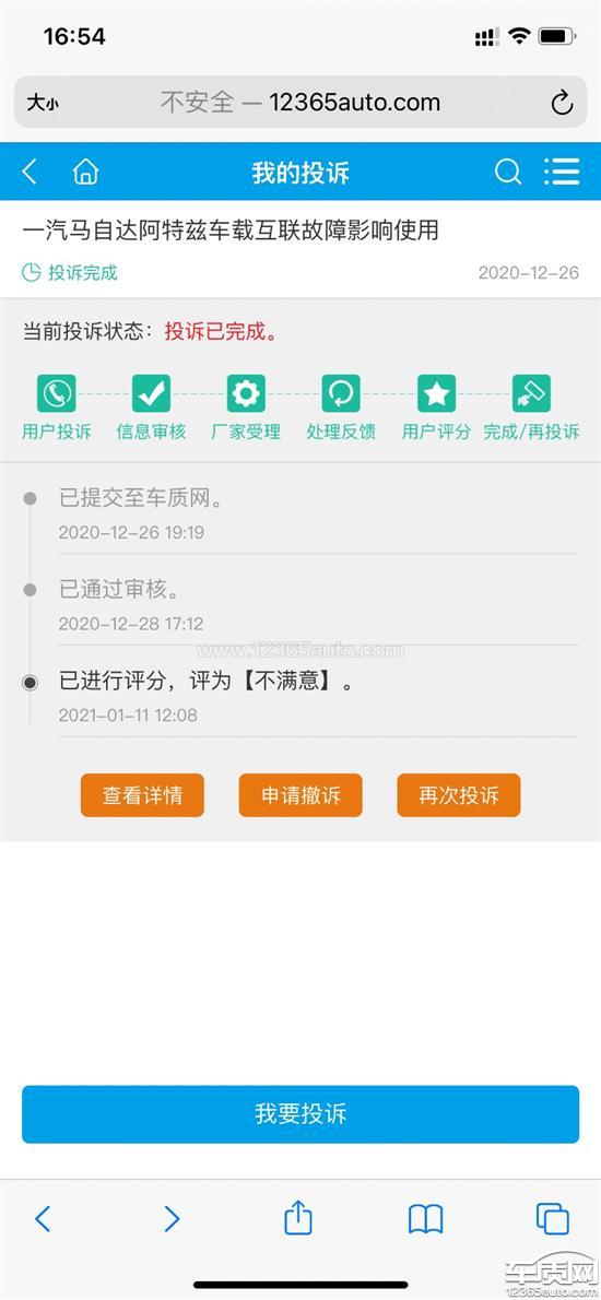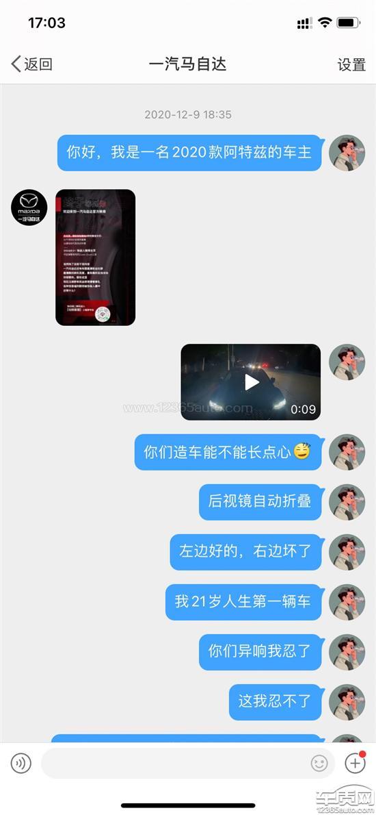 投诉编号:【570822】 投诉时间:2021-02-06 17:11 投诉品牌:长安马自达 投诉车系:阿特兹 投诉车型:2020款 2.0L 蓝天豪华版