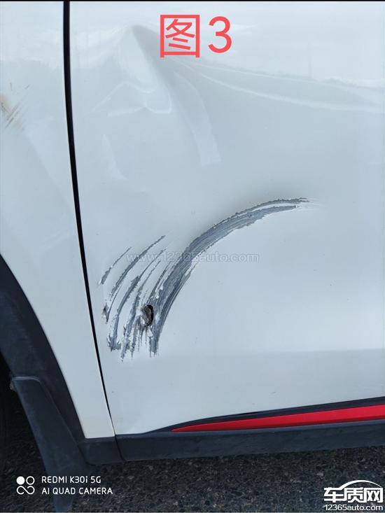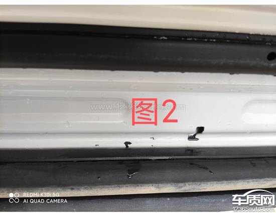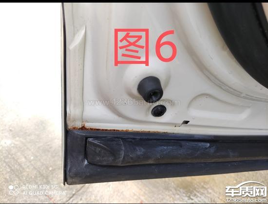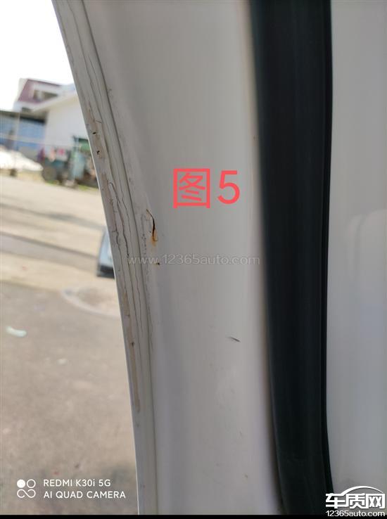 图1和图2为左前门掉漆有撞过痕迹,之前事故更换过左前门见图3,图4,图5和图6为左后门出现裂缝生锈,锈迹斑斑。