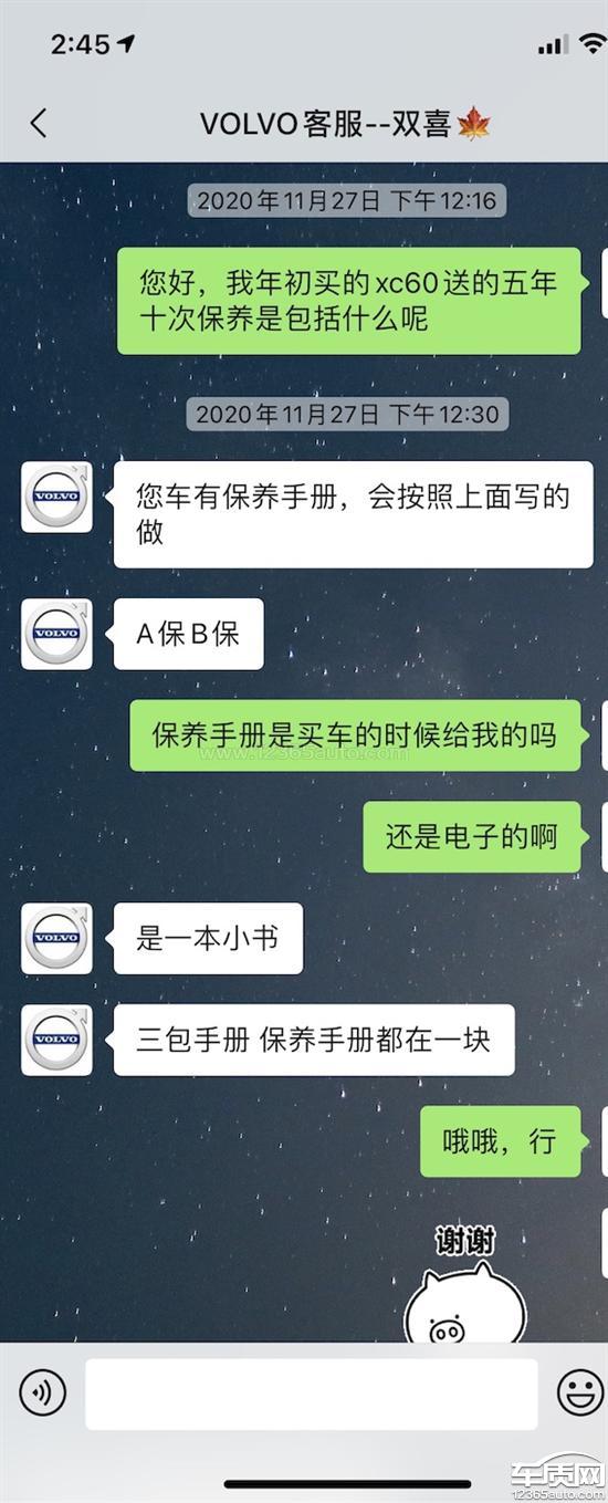 2020年上半年买的xc60,厂家承诺送五年十次保养。后问客服也明确说明照保养手册赠送。第一次去保养时和我说只送十次机油机滤,不包含别的保养。还提出常规保养,基础保养等不同概念。致电厂家客服400-678-1200,一问三不知,基础保养和常规保养的概念一直在调换,且厂家完全没有书面凭证证明什么是基础保养,什么常规保养。只有机油机滤和保养正常项目差很多,连通常所谓小保养项目都达不到,这算送的什么保养?