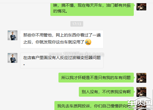 新车开始就一直觉得变速箱很顿挫,在车辆行驶至两万公里的时候,主动花了1835块在4s店更换变速箱油,更换变速箱油之后出现了油门踏板共振的情况。更换变速箱油至今行驶一千公里。回去4s店一如既往地跟我说正常的。但是我每天开这车脚在油门踏板上,时间久了脚掌就发麻。你说如果我不爱惜自己的车辆,乱开把车开坏了我也认了,我还提前保养车辆,各种各样的怪情况都出现,没有一个能帮我解决。