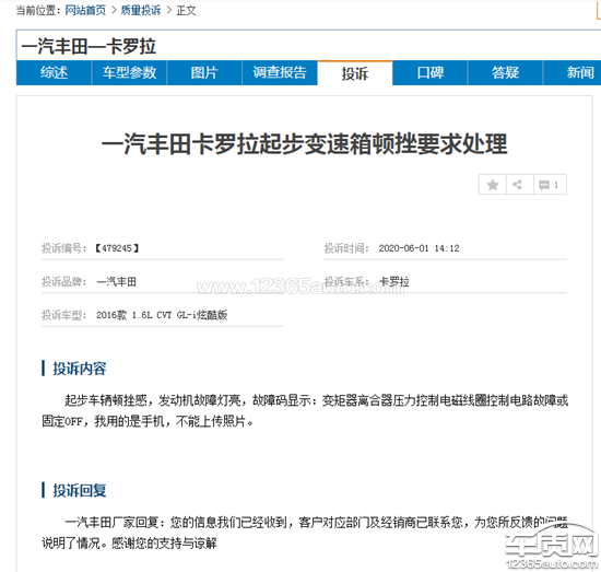 一汽丰田卡罗拉变速箱异响顿挫希望厂家处理2021-06-04车型:2021款 1.2T S-CVT 精英PLUS版