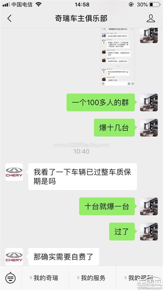 爆暖风水箱,一个100多个人的车友群,有十几台爆过,都是三万公里左右就爆的,几率基本十分之一,多夸张的数据,十台就爆一台。投诉总是抱歉,添麻烦之类的,或者安排4s店跟踪,我就呵呵,意思就是你拖车到4s店修呗,我车都拖到店里了,价格还不是你们说了算,难道我拖走不在店里修吗?换个新的也是同样的问题,估计用了不久又要爆,开着这车都人心惶惶的。只想奇瑞能重视这些问题,搞得这样难道换车还敢换你这个牌子的?知道这个水箱容易爆后,基本上都是在等着它爆的到来,果然爆了,当时的反应是,哇,终于爆了,早爆早安心那种感觉,我就呵呵了。