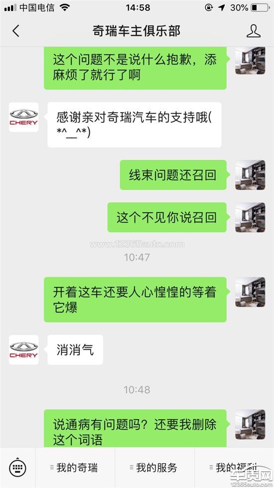 奇瑞汽车厂家回复:“接到贵网反馈的客户信息后,我司非常重视:据我司佛山兴协瑞4S店反馈:已及时联系客户邀约进站处理。具体车辆问题,会积极排查处理。我司会继续做好对该车的跟踪服务,为客户提供周到的售后服务和保障。同时也非常感谢客户对奇瑞汽车的关注和支持,衷心祝您生活愉快,工作顺利!“