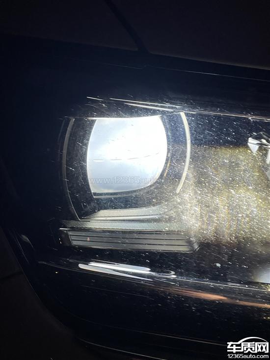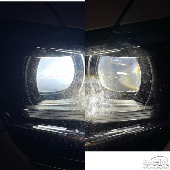右测大灯透镜发白,照明亮度发黄,对比左边大灯明显有色差,高速看不清。