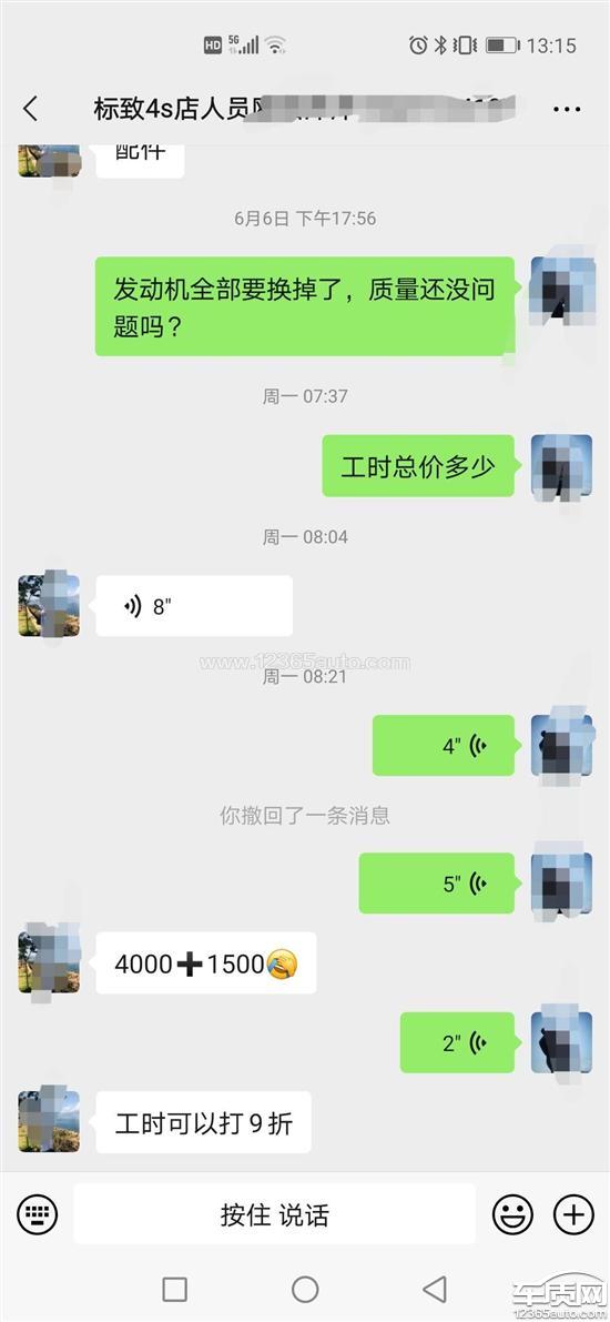 本人17年7年购买了一辆东风标致4008,行驶的公里数3万多一点,车子在今年5月底出现发动机烧机油问题!出现问题后开至广东省河源市东风标致4s店后,要300元检测费,然后告知发动机有问题,接着要1500元(不含维修费)打开发动机进一步检查,无奈只能答应,三天后再次告知发动机存在严重问题,需要更换大量的配件(附图),并且总费用高达3万多块!看着几乎把发动机都换了一个遍,消费者们!究竟标致4008的发动机有多大的质量问题啊!为什么开不到四年的车子,正常保养和正常行驶3万公里后就要大修,他们的车质量何在!我先是进行了4s店和厂家沟通,他们给我的答复就是我个人问题,丝毫不承认自己的发动机存在严重问题,反而说我保养不行,说我个人造成的原因(都有电话录音),我反复打电话给标致服务热线进行投诉,反复强调我的车子保养正常!未发生过碰撞,甚至保险都没出过!怎么会是我个人问题!厂家一直不重视我的情况,也不深入了解我的车子为何要换那么多的配件,就只是说我的车过了三年质保!做为消费者我实在是冤!刚过来三年不足四年!关键是公里数才3万公里啊!就要发动机大修!烧机油!更换一堆的配件!工时费5500!于是我在各平台上对其进行投诉,前天给我的答复就是在原来的3万多的基础上减少更换的零件,相应的价格减掉,但是还是要2万多,同时告诉我那些不更换的零件可能很快又会有问题!他们概不负责!我想说这究竟是什么负责态度!总书记说的担当精神为何在这样一个品牌车辆公司没得到任何体现!这不是相当于还是由我消费者个人承担吗?厂家由头到尾都是躲在背后,不肯调查,不肯负责帮我保修!我的车子放在4s店半个月了,一直等厂家答复具体情况,厂家都没有直接向我解释发动机究竟是怎么了!为何要更换那么多配件!为什么不愿意承担该有的责任!