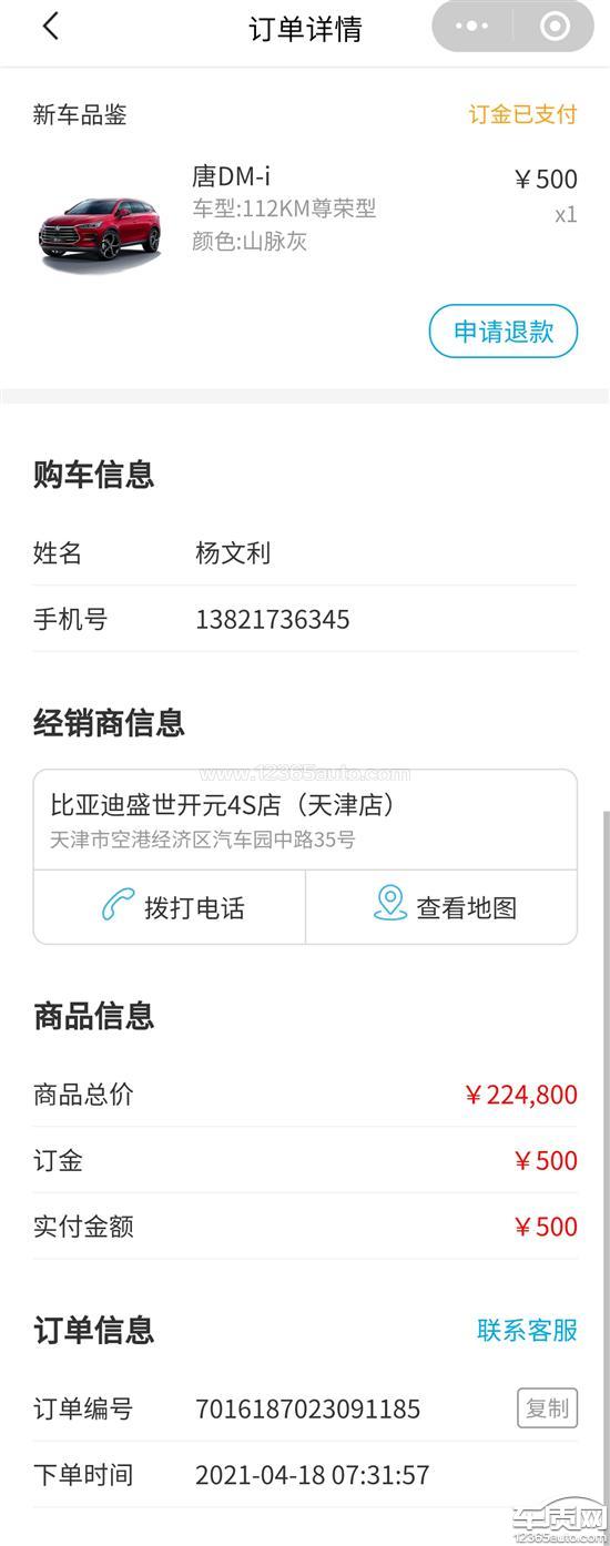 比亚迪唐新能源微信交付订金厂家不承认2021-06-21车型:2021款 DM-i 112KM 尊荣型