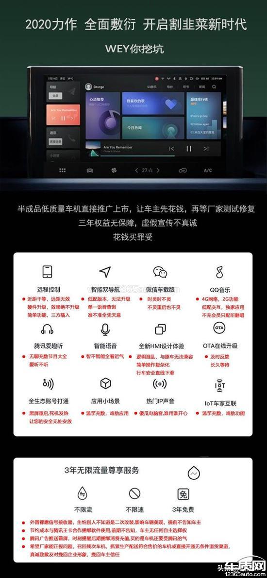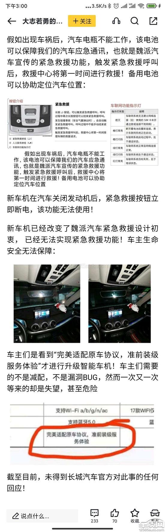 通过两年的不懈努力,魏派17~19款老年车机终于迎来了官方后装有偿车机,当时吹牛该车机独一无二,结果我们选装后发现一地鸡毛!还是个存在隐患的三无残次品,过去这快一年以来,一直和厂家沟通均无果,去年底自媒体久央广网均跟踪过此事,但目前一点消息都没有!难道还要我们老车主带着这三无残次品在我们顶配车上一直存在嘛?在魏道APP上可谓是到了谈机色变的地步!之前我们只是忍气吞声在APP社区反映问题,现在只能寻求外缓帮忙了!望长城官方正视此事,给我们老车主一个合理的解决方案,我们不想再沉默了!