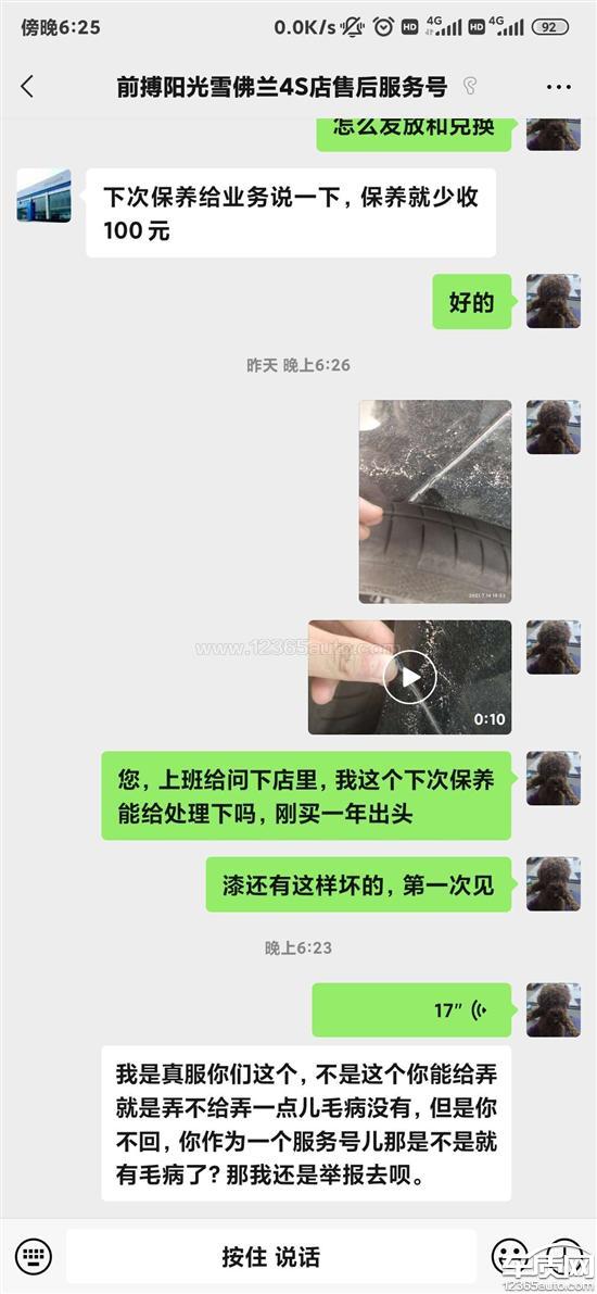 车身漆面开裂,我的车买了一年2个月,今天才发现这个问题,我之前的车开7年也没遇到车漆裂开的问题,4S店该不该给我修我不敢定论,但是我反馈了车辆的问题,他们不回复肯定是不对吧,不回复还弄什么售后服务号?当摆设吗?在这里我一并投诉这家4S店所有的问题,1.远程启动后主驾驶侧车窗偶尔失灵,4S店让我下次来处理,下次去4S店,4S店试了几次说等车辆的故障试出来再说吧。2.新车礼包里送了车内杀毒、安全检测、空调清洗,我问他们怎么用,没人知道,他们总是告诉我下次到店再用,3.再说说更逗的,我第一次去4S店试车,他们只让我在店门口前转一圈,不让开60KM/H以上,试车没有3分钟,然后回到了店里,刚坐下,我说您给算一算落地价,这4S店的人员站起来,看着远处,背着我们说了一句,有事打电话吧,既然说了有事打电话,你倒是给我打电话啊?至于为什么我后来还去那里购车,因为2020年4月,朝阳区是全国唯一一个高风险地区,我为了买车,不跟他生气,第二次去4S店交了定金,那个4S店的人员还舔着脸过来问,您是不是之前来过呀?我看了他至少一秒才认出来是上次那个人,因为换了一张脸,一张笑脸,语速都变快了。4.购车后给好评,4S店送东西,后来官方发了提车礼包,给我来短信了,APP上提示领取了,然后销售经理和领导唱一个红脸一个唱白脸,在我面前唱戏,唱得我都不好意思了,领导说销售,无论如何你得把这东西给人家凑出来,后来我去提车的时候我也没要,因为这戏唱得我都不好意思要了。