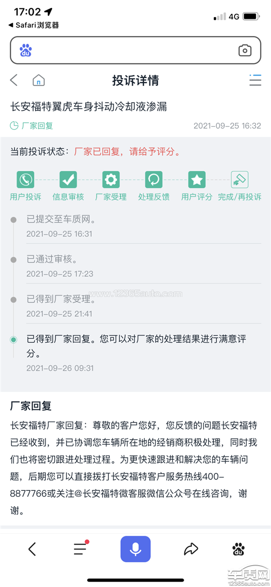 长安福特厂家回复:尊敬的客户您好,您反馈的问题长安福特已经收到,并已协调您车辆所在地的经销商积极处理,同时我们也将密切跟进处理过程。为更快速跟进和解决您的车辆问题,后期您可以直接拨打长安福特客户服务热线400-8877766,谢谢。