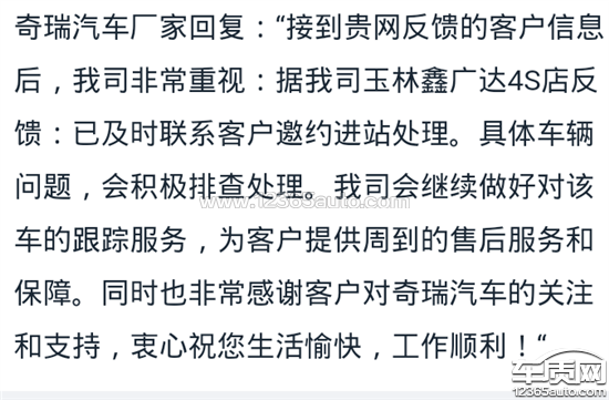 奇瑞汽车厂家回复:“接到贵网反馈的客户信息后,我司非常重视:据我司玉林鑫广达4S店反馈:已及时联系客户邀约进站处理。具体车辆问题,会积极排查处理。我司会继续做好对该车的跟踪服务,为客户提供周到的售后服务和保障。同时也非常感谢客户对奇瑞汽车的关注和支持,衷心祝您生活愉快,工作顺利!“