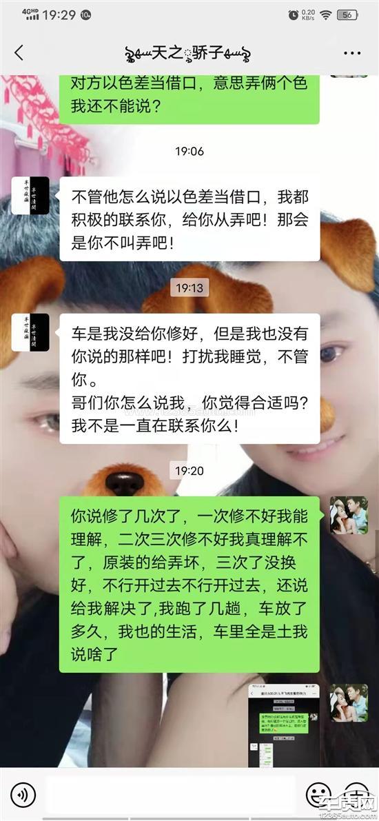 去4s店头回修车前后保险杠喷漆,叶子板,修理结果喷漆出现裂纹,第二次,保险杠出现色差,保险杠左右颜色都不一样,之后一直联系4s店,多次联系,第三次修理,出现起漆,之后微信联系4s店人员,不给我处理,还说我以色差当借口,晚上9点还反问我,说现在是上班时间还是休息时间,前前后后修了一个月,每次都是打车去4S店,我想得到个合理的解决方案,请求帮助,还有就是他们把原车的配件都拆坏了。