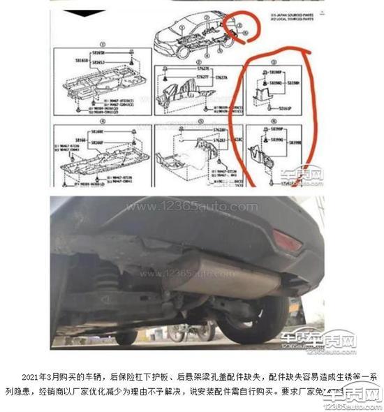 该车型存在后杠下护板缺失的问题,是厂家偷工减料行为,据车友反映,2018款有,2020款部分有部分无,2021款都无,本车2020款无。护板缺失容易造成车体底盘腐蚀。对此,我要求厂家尽快加装后杠下护板。