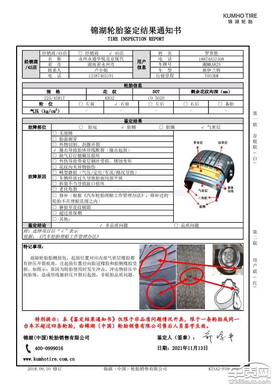 11月10日拨打400服务热线咨询轮胎是否有质保期,得到400回复说有!然后给我预约到店日期!当天4s店就给我回电话确定到店日期!但是并没有告知4s店没有轮胎检测机制而是通过现场拍照进行厂家反馈!厂家凭照片给出检测结果;13日到店后4s工作人员就进行拍照并告诉我结果等3天才能出来,我当场就不认可要求当天出结果!可是4s店拍照后就离开了也没有人员和我进行沟通和处理接下来的事,我在4s店3个小时工作人员和沟通的时间不超过20分钟就走了!全程都是我找他们沟通和打电话给400厂家投诉他们服务态度问题!后面我是在被逼无赖的情况下开车堵门的!这个时候他们的有一位帅哥自称为整个售后服务部的主管说自己可以代表厂家处理这个事,最后我把车挪走后自己不承认可以代表厂家只代表他们公司处理这个事,还说轮胎厂家要求他们提供什么就提供什么,轮胎厂家给出的鉴定结果就是合法的!轮胎厂家质检员一手可以遮天目中无人的态度,和他电话沟通过程中在电话里面他说什么事他自己说算!!!这个厂家轮胎我在北京现代自己的APP上面搜到很多和我一模一样情况的车主,都是自行鼓包!厂家给予的鉴定结果都是一样!网上有很多锦湖轮胎的曝光!