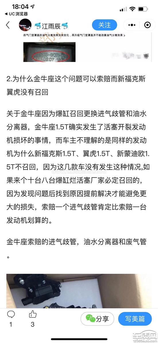 正常行驶中,突然发动机异常抖动,无力,提不了速,后经检测,发动机进气管里存在大量机油,导致发动机2缸失火,缸压不足。然后上网查询,发现出现这种问题的不少,都是搭载福特1.5t发动机的车型,包括金牛座,蒙迪欧,翼虎和福克斯。由于1.5t发动机油气分离器设计缺陷,导致节气门后面进气歧管存在大量机油,有损坏发动机的重大安全隐患,已经有不少车主出现爆缸的严重问题。长安福特1.5t的金牛座以非官方的形式通知车主进行更换进气歧管,油气分离器和通风管,而同样发动机的其他车型却不管不顾。现在厂家只同意索赔进气歧管,油气分离器和通风管,对由此引发的发动机故障不处理。