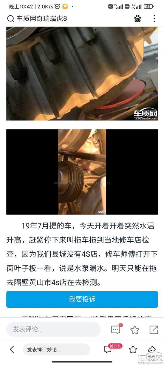 奇瑞瑞虎8水箱漏防冻液 售后不予处理2021-11-15车型:2018款 1.5TCI 手动 豪华型 5座
