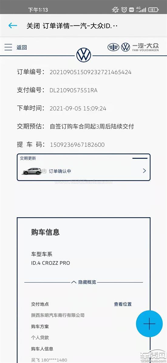 投诉编号:【666661】 投诉时间:2021-11-17 13:57 投诉品牌:一汽-大众 投诉车系:ID.4 CROZZ 投诉车型:2021款 长续航PRO 两驱版