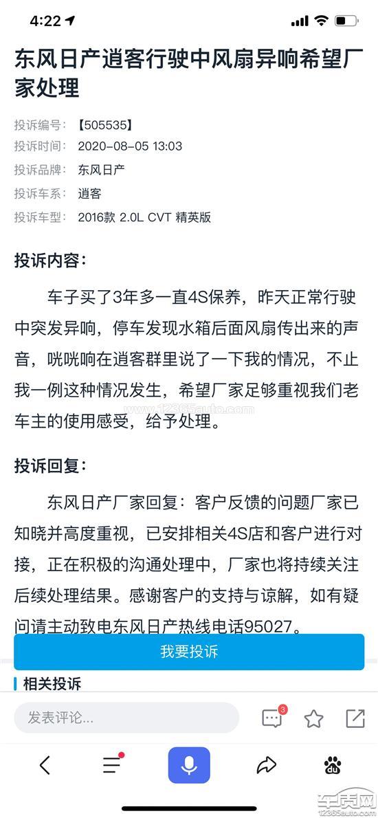 去4S店检测以为是散热风扇掉螺丝或者松动,师傅是这个必须更换风扇,同款车型已经换了很多,不用看,接待维修人员报价,说这款车型这个问题通病,既然通病为什么不能免费维修呢,请东风日产重视,给个答复尽快解决问题,质量问题不能来到4S店就割韭菜,直接763元风扇,工时240元,不商量。希望免费解决。