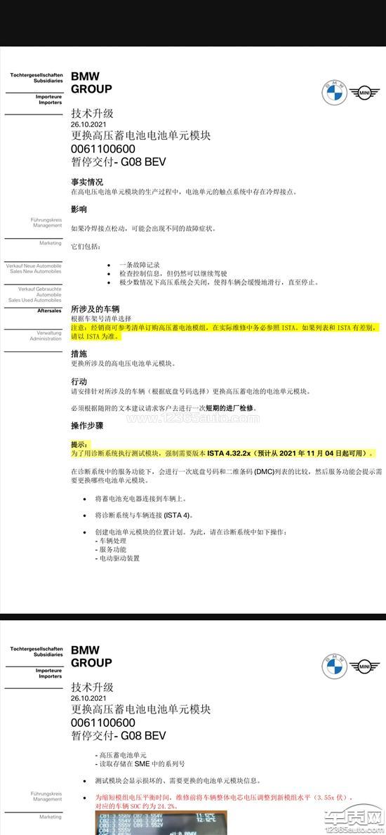 宝马iX3自推出以来就有传动系统损坏的风险,事情起因很大可能是动力电池存在冷焊接点,如图中官方内部文件所示。宝马通过经销商联系车主以“技术升级”为名,让车主把车开到4S店进行问题电池的更换,企图掩盖电池缺陷问题。11月17日,宝马在mybmwapp上对该批次车主进行先后两次推送(第一次推送提到“可能存在故障”,结果很快就把该推送撤回,改为“需要升级”),再一次对电池问题进行美化、掩盖。作为中奖车主,我的诉求是:1.宝马厂家应正视电池原生缺陷问题,执行正规的召回措施并备案;2.宝马厂家应合理补偿受缺陷问题影响的车主因电池更换所造成的车值折价、潜在衍生问题等损失,包括但不限于车辆延保、一次性经济补偿等。