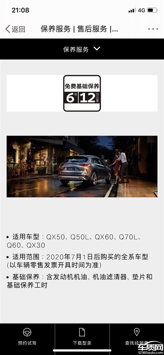 虚假宣传与宣传内容不符。无法享受到东风英菲尼迪最新的6年或12万公里免费基础保养政策。厂家的宣传明确注明了6年或12万公里免费基础保养政策,适用于2020年7月1日后购买的全系车型,是以车辆零售发票开具时间为准。而我的车辆销售发票开具日期为2020年7月25日,现在无法享受这个保养政策。2021年4月17日至今多次发邮件到厂家邮箱,都是敷衍回复。我的诉求很简单,把我的车辆信息录入厂家保养政策系统,录入系统后可以在东风英菲尼迪车主服务公众号里面可以查询到相关保养次数信息。