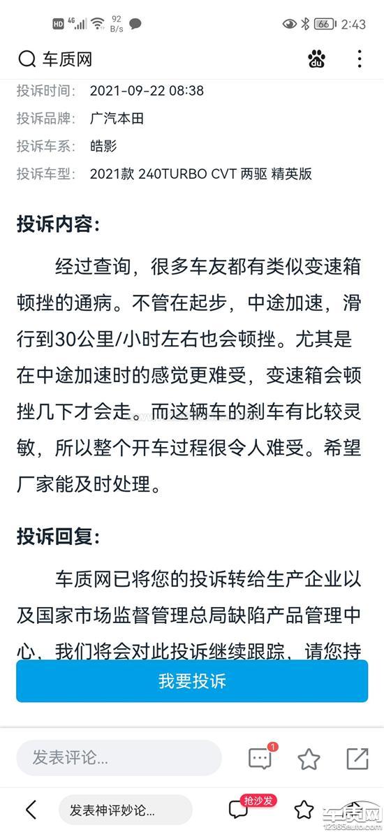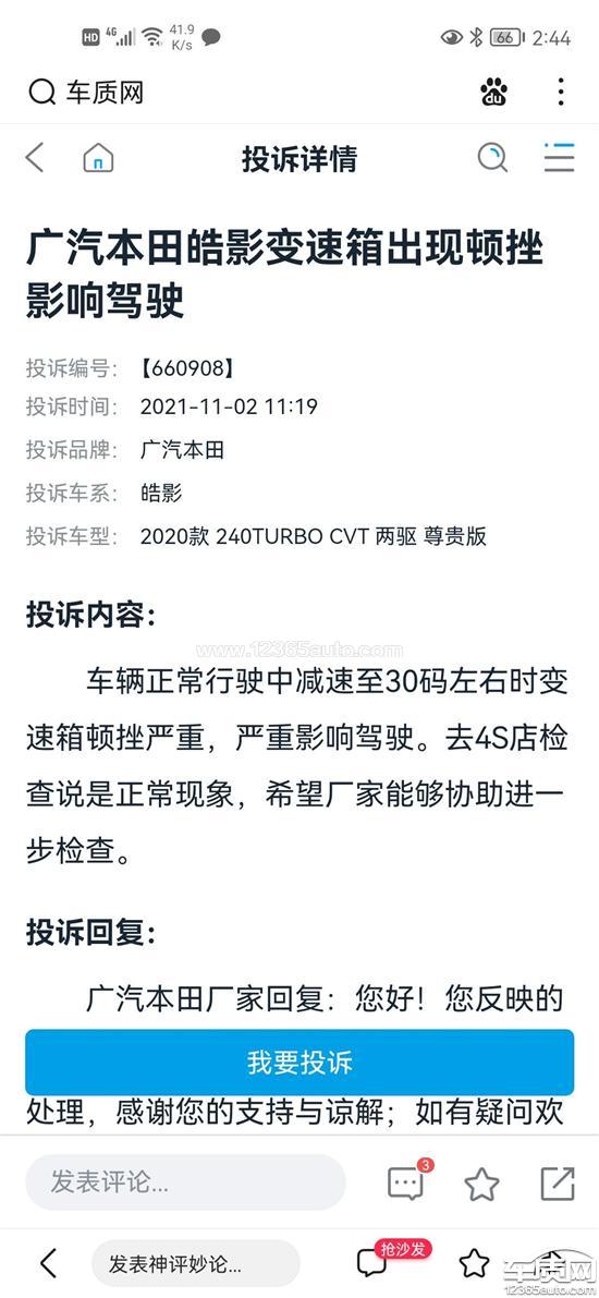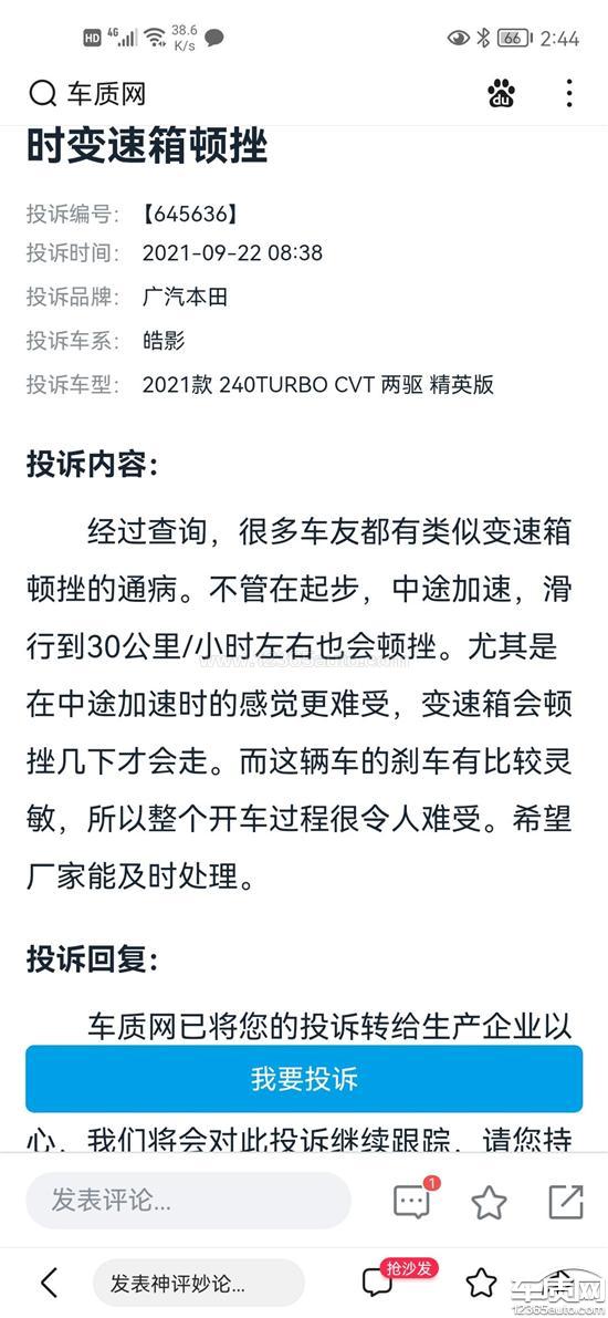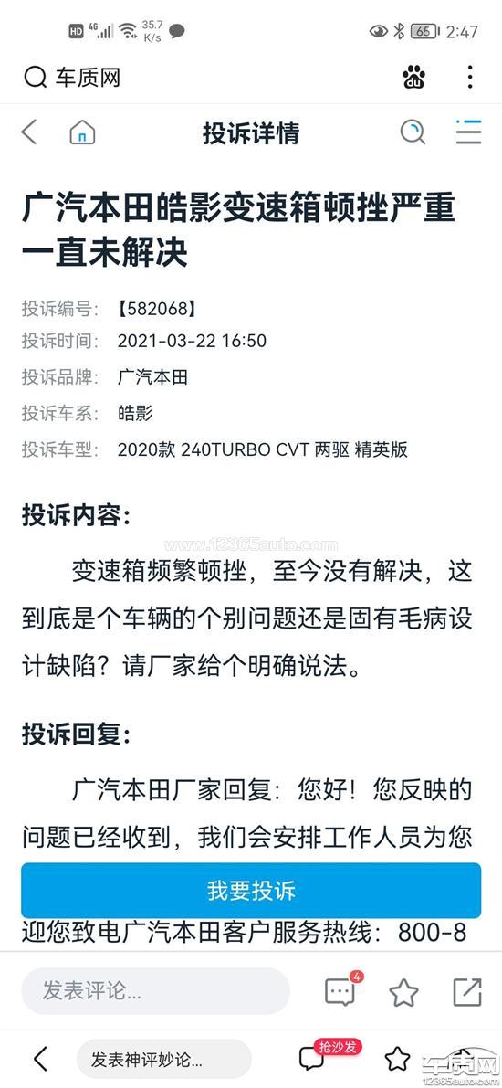 投诉编号:【673052】 投诉时间:2021-11-30 15:01 投诉品牌:广汽本田 投诉车系:皓影 投诉车型:2020款 240TURBO CVT 两驱 精英版