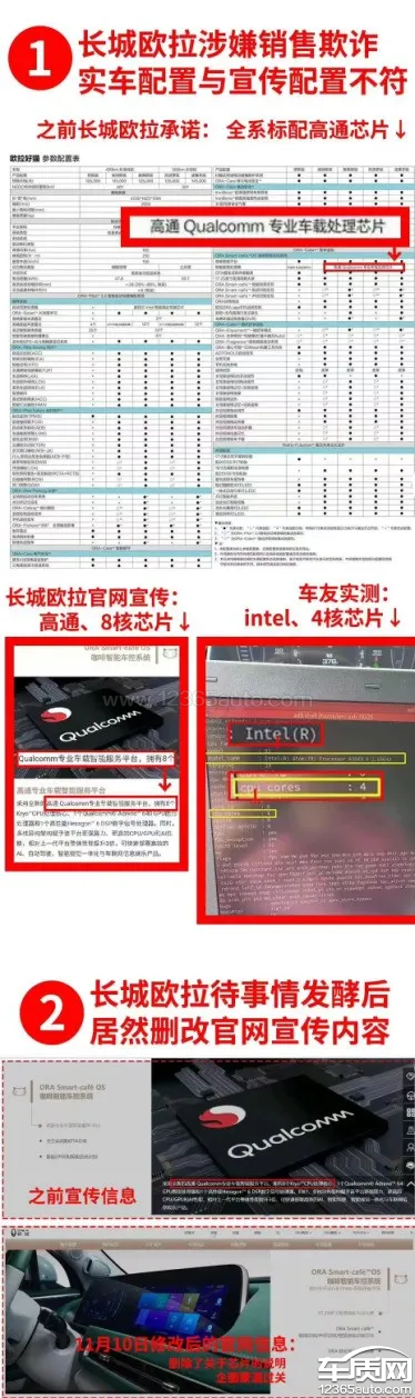 长城旗下欧拉好猫车型(智能电动汽车),在宣传页、官网、发布会及相关介绍材料中声称其车机使用的是八核的高通8155芯片。而在2021年11月有车主自主检测发现该车型并未搭载此芯片,取而代之的是2016年生产的英特尔四核芯片。而长城官方后来也发公告承认了没有使用高通芯片,并狡辩为是“在未来车型中使用”。不仅汽车的性能大打折扣,还影响到乘车人及马路行人的出行安全。同时欧拉好猫在泰国、英国发售,而泰国试车中可以看到有carplay界面,以此证明泰国的好猫搭载了高通芯片。欧拉好猫在国内外双标,对内欺诈消费者,对外有损民族企业的声誉,希望更换芯片。