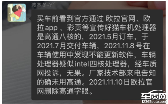 欧拉好猫车机芯片型号与宣传不符2021-12-17车型:2021款 500km 长续航 阿波罗版 三元锂