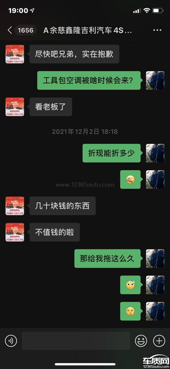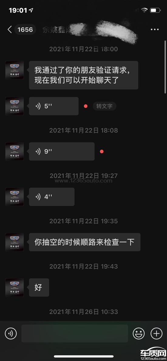 吉利汽车厂家回复:您的信息我们已经收到,将尽快协调相关4S店与您核实处理,厂家也将持续关注后续处理情况。感谢您的支持与谅解,如有疑问欢迎您致电吉利汽车客户服务热线:400-886-9888。