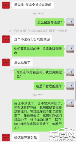 本人2021/12/18在深圳大众4s店购车,销售员说有现车,谈好价格后,销售员就诱导我赶快去先交5000元订金,去到财务窗口又突然变卦让我交10000元的订金,我就反问销售员说先交个2000,销售员说最少要交5000元作为订金,当时向销售员提出能不能让看了合同在交订金,销售员说必须先交钱再打印合同,于是在销售的诱导下不太情愿的下又交了5000的订金,合同打印出来后,销售指着合同需要签字的地方,让我签字就好了。合同上写得也不完整,合同上只是写了单方面交首付的日期,也没写交车日期,第一次买车,签完字后发现合同中的定金和交钱的收据上写的不一致,订金却写成定金,合同中重要格式条款也没跟我解释清楚,没有提示重要条款,打印出来的合同字体不清晰,有个备注事项的字只有一半看不清楚,当时多次要求销售员从新打印一份清晰点的,遭到销售员的拒绝(态度不是很友好)当时也跟销售员口头上说如果不买了或者贷款没下来能不能退还订金,销售说贷款没下来可以全额退还。回去让我等贷款通知,12.20接到大众金融电话访问贷款事项,问的情况比较多,也确实让我难以接受,听到金融公司客服介绍了还款问题,让我感觉压力很大,想起之前有过贷款事项因征信问题未过,再加上前一天接到医院通知让我过去做取内固定手术事项,听到医院的费用预报让我没有能力去按揭贷款买车,然后就跟销售员在微信协商退款订金的事宜,于是12、21上午12点50号去到他们店里,销售员让我先等一会跟他们领导谈这个事,于是把我晾在一边到了下午13点20左右他们领导才出来跟我谈退定金事宜,然后简单的谈了之后说第二天下午才给我通知,然后等到第二天下午我在问接待我的销售员,他告知我退不了,多次与销售员在微信协商退款事宜遭到冷漠拒绝,后面也没回我信息,于是没办法在12.22日打电话给上汽大众总部去和经销商协调这事,但是总部的答复一个工作日会有人打电话给我,结果拖了两天,于是12,25号再次带电话给总部问此情况,总部给的答复让我再次等电话联系,直到现在都没人联系我。4S店疑点和不合理 1、合同内容对消费者不公平,只写单方面交首付事项,没有明确写交车日期。2、合同中重要内容写的不清楚,与交订金收据写的不一致,备注项只写了一半字体看不清楚(合同可以作废处理)。3、诱导消费者先交订金再签他们的霸王合同,极其不合理。4、合同中重要的格式条款没向消费者解释清楚,没有提示重要条款。5,贷款没下来,没钱购买。希望有关部门帮忙协调购车订金退还给受害者,维护消费正当权利。