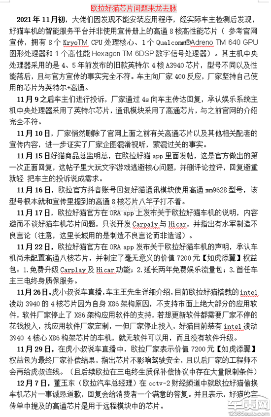 欧拉好猫官方宣传芯片型号与实车不符,要求尽快处理。