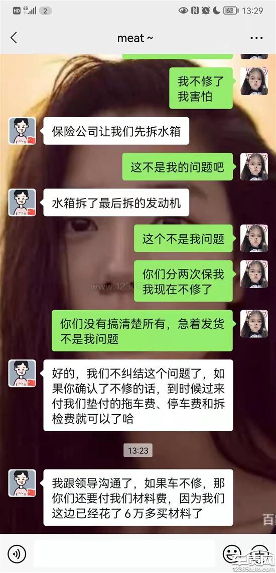 12月12日出了事故,车辆于13日拖到四川凉山彝族自治州西昌市4s店,两天后该店售后工作人员通过微信发了一份需要维修以及更换的配件清单,配件金额为¥74571元、不包含工时费,该店售后李姓工作人员告知后续可能还需要补一些小材料,一个星期后该李姓工作人员突然告知我变速箱也坏了,本来发动机、底盘、大梁都有受损,再加上变速箱也受损,我拒绝维修,要求保险公司定全损,当时保险公司同意定全损,4s店表示需要我支付材料费6万元,还不包括拆检费、停车费、拖车费,同一时间4s店与中国人民财产保险公司西昌分公司定损员勾结,定损员告知我4s店已将维修费用降至7万元,无法达到定全损的条件,本来要10几万才能修好的车辆,现在7万就要修好,而且没有与该4s店签订任何订货协议、维修委托协议等,就要将他们所说的已经订的配件强行卖给我,当我在12月25号去到该4s店要求他们提供明确属于我车辆的订货单时该店无法提供,只提供一份纸质机打的单子说上面就是我的配件,要求我支付订货费用4万多元,与此前该店售后李姓工作人员说的6万元也不符,该店试图将自己的责任转嫁到消费者头上,试图通过这种方式强迫我将车辆在他们公司进行维修。我希望车辆能公平公正地处理。