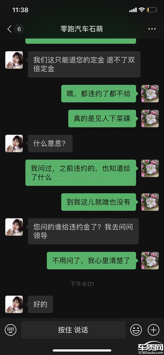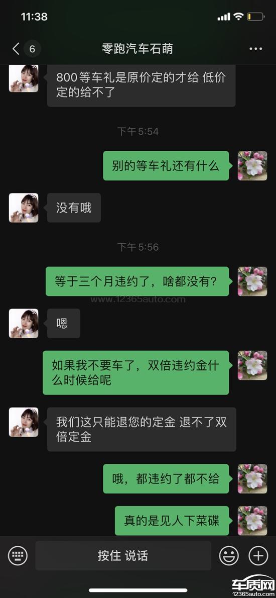 销售说不存在800元20天等车礼,并且3个月未交付违约,也只说就光退定金,任何都不给赔偿,要求厂家协助解决。