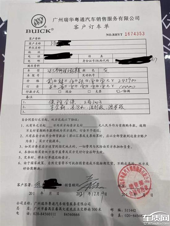 本人于2021年12月19日在广州别克4s店交了1万元订金订购一台2020款别克昂科旗汽车,订车时销售只让我看了展厅的车,展厅的展车是2021年6月生产的。销售说我订的是最新日期的车,订车单也注明全新车,现在给我的是2020年12月的车,找销售协商退换,销售称我订的是2020款的车,2020款的车就是2020年生产的,并称法律上没有库存车的说法,库存车也是全新车。我问销售你们的车是放在车库还是户外,销售存心误导,说放在车库,才刚刚运到,因车外观轮胎等不像是车库存放,我就再问销售,销售称车库就是户外,跟我玩文字游戏。另外问了销售说汽车内饰颜色和展车一样是棕色,现在内饰是黑色。现在车外膜是被撕掉的,有细小的划痕,合同注明无划痕。我找销售协商更换回2021年6月左右生产的2020款昂科旗或是退还我1万订金,一直无果。之前也已经联系厂商,厂商说处理不了。本人现时也是别克车主,现在置换新车,想着一直支持别克,但现在对别克品牌甚是失望。现请求车质网给予帮助。希望协助本人退还1万元订金。谢谢车质网!