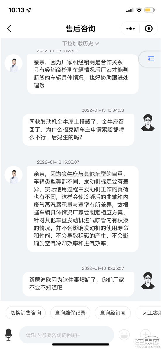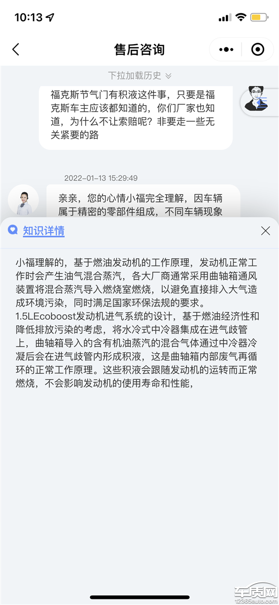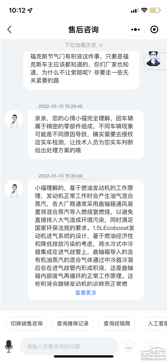 之前做保养的时候,每次都在节气门里面抽出来好多机油,至少500毫升,5000公里少一升机油,这刚做保养没几天,我看机油又少了,仔细一看节气门里面又有机油了,从节气门流出来了,流到变速箱底下,向4s店和厂家索赔改进型进气三件套,两方都在打太极,厂家说这是正常的,4s店说要检测,这个问题同样出在蒙迪欧金牛座翼虎身上,为什么只有金牛座召回了,新蒙迪欧因为这件事都有爆缸的,厂家难道不知道吗?别的我也不想多说,直接给我换改进型的三件套,别扯那些套路,走这程序那程序的,我只相信唯一的真理就是免费更换改进型三件套。