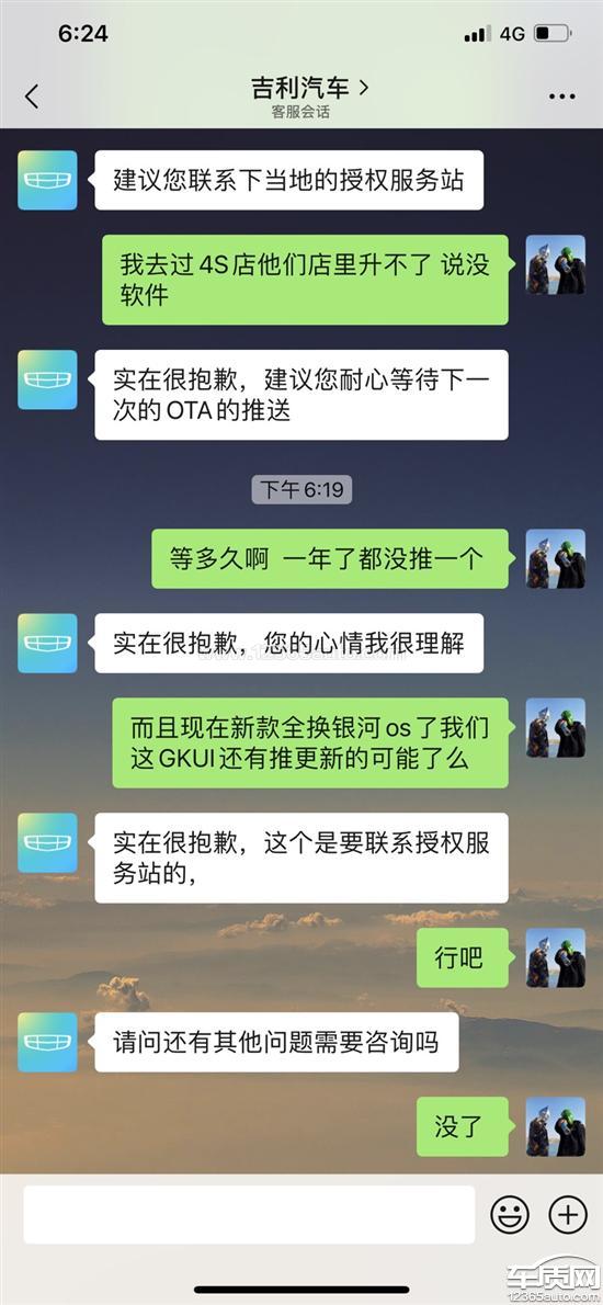 车买了快一年了车机完全没有宣传时的效果车机系统不推送更新一直0.1.8连语音开启后备厢都不行,无意间问了下朋友的车同样配置的车他车机原厂2.3.9同样的配置车机系统版本都不一样,纯纯的双标行为,车机里的软件最新的版本都是2020年10月份的什么更新,也不推送carplay和hicar也不开放,自己也无法安装别的软件,去4S店说没有车机升级软件无法升级,说真的这车机还不如外面汽配城后装的安卓车机,然后车机360全景的联动转向的意义在哪里?我打个转向灯还要我手动开启全景影像才能用,减配什么的都懒得说,手套箱缓速器二三十块的东西都能减配,在吉利官方微博发个评论得不到不回复扭头就删评论。