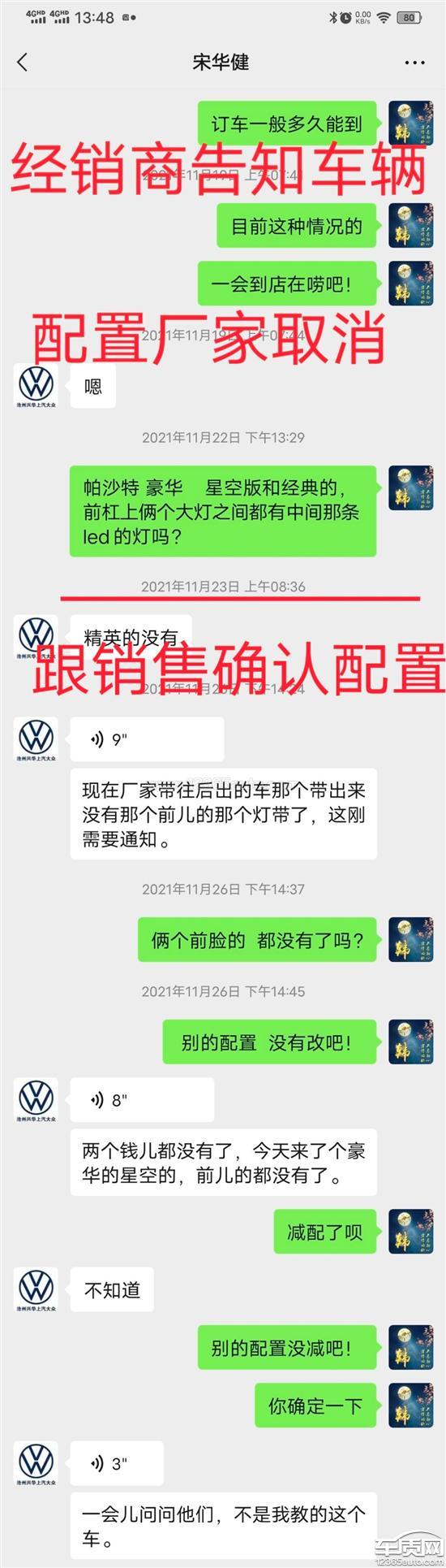 11月19号,通过交定金,在沧州汽车销售有限公司分期置换一辆大众帕沙特330豪华,11月28号销售通过微信告知车辆到了,同时告知厂家以后在出的车辆配置更改了,告知的是(车辆配置差一个大灯,一个前面的灯带一个照地灯三项配置)经销商多次强调以后厂家在出的车没有这三个配置了,当时并没有对车辆配置做对比,当时交完了除购置税以外所有费用,由于当天日礼拜天上不了牌照,车经销商没让开走,11月29对比了一下配置实际差了(前杠灯带矩阵LED大灯,大灯自适应远近光,门槛迎宾灯,)而经销商告知的差的那三项配置,后经过在别的店,和厂家客服给到的回复,实际车辆配置厂家并没有取消,少的这些配置实际是经销商选装,和厂家和经销商沟通一个多月了,始终不给解决,经销商说是厂家减配,厂家就说经销商选装来回推脱不给解决。