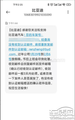 1月28日,根据比亚迪流程提示通过邮箱提交车主认证资料也收到了邮件回执函,比亚迪官方所答复的三个工作内,都快一个星期的工作日了。截至到今天还没消息,问问比亚迪官方客服,居然说没收到相关认证邮件,争着眼睛说瞎话,而且一点都不着急,已经多次反馈没有结果。服务太乱了,我每天都在开车,不能使用车机系统太难受了。