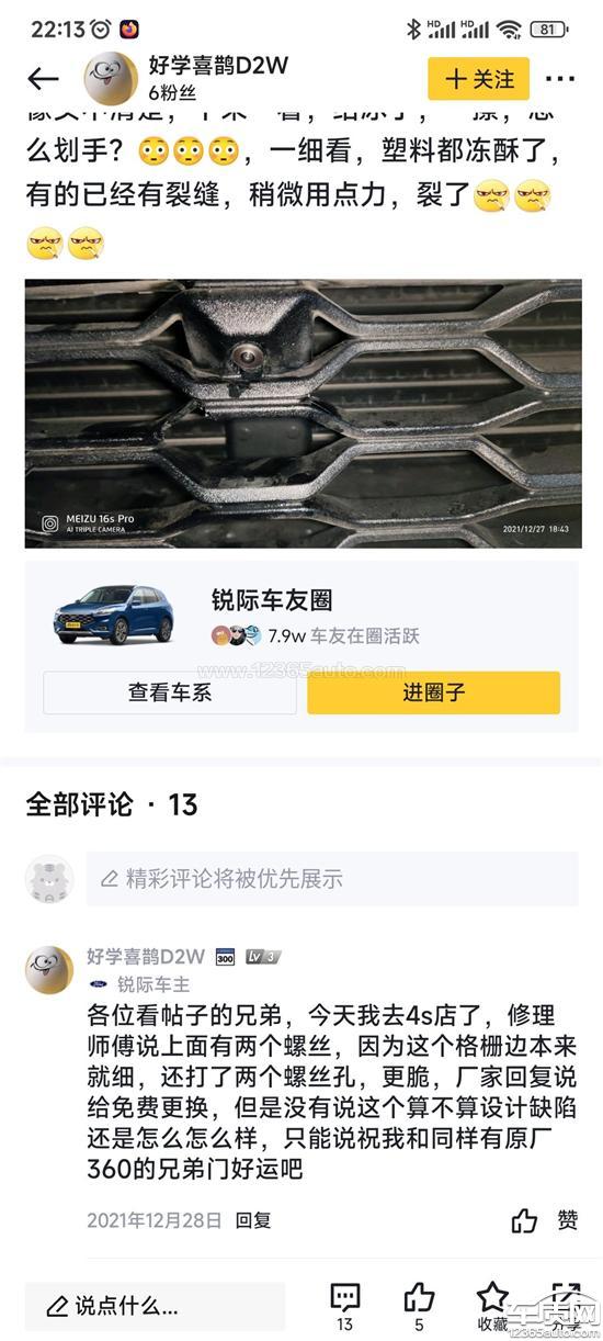 2020年12月购车,车辆中网前摄像头支架位置塑料碎裂,车辆并未有任何碰擦痕迹,4S店现场检查拍照上报厂家后,厂家以人为碰撞为由不予索赔,但我的车辆是没有任何碰撞痕迹的,网上我也看到几个月前有同款原厂加装360车主和我类似的情况,厂家却给免费更换了,我的也是原厂360前摄像头支架位置开始裂的,有理由怀疑是中网材料单薄,加上摄像头支架螺丝打孔碎裂的,要求厂家质保更换。