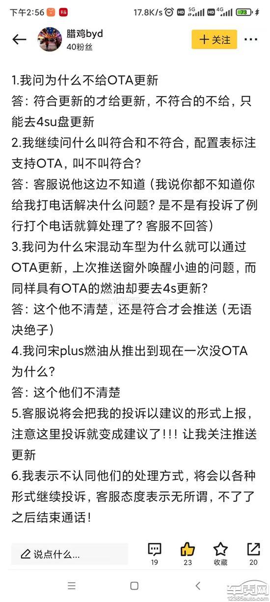 1、比亚迪宋plus燃油版本上市至今三年!厂家当初宣传的OTA升级为一大卖点,至今车机ota升级功能无法使用,厂家从未向比亚迪宋plus燃油版进行ota推送升级,官网有升级包,但只能前往4S店使用U盘升级,无法正常享受0TA升级的功能,享受不到对应的功能,且车机自带导航三年不更新,体验非常不好,只能自行前往网.上自行下载安装包使用优盘安装。系统不推送dlink4.0系统, 同等情况下宋plusdmi等其他新能源车型就可以享受ota升级,比亚迪明显区别对待燃油车型!严重怀疑比亚迪在欺骗各种消费者。2、其使用的625车机芯片严重卡顿,2020年比亚迪车都使用了625芯片,不过2021年因为汉唐车主呼声较高,推出了665车机芯片升级包。但宋plus燃油芯片2年了一直没有推出升级方案,在此我们要求厂家推出针对燃油宋plus的665车机升级套餐,加高清360解决方案。