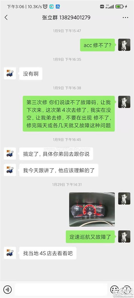 ACC报故障码,其实ACC完好无损,广州市明烜昕商贸有限公司前后去了4次,修了3次,前两次修改都是隔日就出现同样的问题,第三次修完后用了一个星期左右,又出现同样的问题。在维修完第三次,明烜4S店就口头承诺,若再出现同样的问题会找厂家来解决这个问题。前3次维修走的都是质保,因为ACC是完好无损的。4S店描述的故障原因是因为ACC位置有偏差,导致的报故障码,而ACC是能正常工作的。借着车要保养的机会顺带维修ACC,但第4次维修要换3个ACC卡帽,工时300。而ACC卡帽在第一次维修的时候就已经换过。感觉一直在做着毫无用处的维修。希望厂家和4S店能认真解决这个问题。