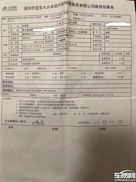 2021年7月25日在深圳市宝安大兴丰田汽车销售服务有限公司缴纳10000元整的购车意向金,在2021年10月1日在深圳大兴亚洲龙丰田店提了车之后,首次出现天窗异响问题为2021年10月16日,于11月13日返回大兴经销店内维修;停放车库一周内又发生异响问题,再次返回大兴经销店内维修,这次提供的维修方案为拆除车顶维修,本人不同意新车购买不到两个月就被大拆,维修主管现场承诺拆除天窗维修后能保障异响问题不再发生,便同意拆天窗维修;同时我们也提出了疑虑,车辆才落地不到两个月异响问题多次发生,要求经销店与厂家给消费者一个说法,但并没有正面的回应。第三次出现异响天窗异响时间为2月14日,一直持续异响,这次同时也发现车内的异味问题也暴露了(非新销售车辆的异味),3月13日将车辆放至经销店维修,经销店对接人于3月24日晚20:08分回复车辆已处理完毕,让我们去试车看维修情况,3月27日中午当大兴经销店进行试车,试车过程发现车辆天窗右侧异响问题已无,但左侧天窗处有异响,然而问题持续,车继续维修,经销商未开具维修结算单给我。4月2日经销店对接人联系说车辆异响问题的解决方案是将整个天窗拆除更换,但无法保障异响问题能根本解决,我们拒绝了该维修方案,考虑到车辆贬值等问题…目前车辆还持续停在4s店内等待经销店与厂家的处理方案,目前为止都没有一个具体明确的处理方式,新购买的车辆不到半年就要面临大更换。经销商对接人承诺4月10号给具体的答复,但至今并未得到任何解决方案。经销商与厂家持续互相踢皮球,我们4月11日去店内询问解决方案与进度,被现场负责对接厂家的售后维修负责人在现场说了句“我收到厂家的回复,我也不告诉你”我们被迫无奈之下,选择在店内做了报警处理,请民警协助督导推进。民警询问经销店的对接人与经销店售后总监,车辆是否存在自身质量问题?他们承认车辆本身存在质量问题,唯一的维修方案只能是更换整个天窗。每天给丰田厂家打400客服去电投诉问题,但是厂家只回复了一句“全权委托经销商处理”。经销商回复说“厂家没有给具体的方案,他们也不能决策”,目前双方互相踢皮球。我们也在12315平台提交了诉求,目前还在办理阶段,目前暂未有工作人员联系,这是我们90后夫妻的第一辆车,对专业知识很缺失,也是第一次经历这样高额的消费蒙骗,完全无经验,请求给予专业的援助。