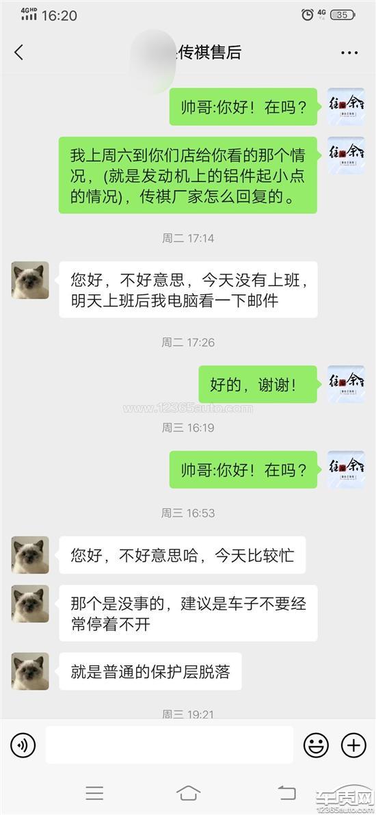 2022年1月份在湖南省张家界市购车后,于2022年2月8号开车至广东汕头,4月3号到当地4s店做首保时发现,发动机舱内铝件部分,及发电机铅件有很多小斑点,之后通过4s店向厂家反应,4月8号厂家反馈“保护层脱落,没事”之后再无联系。