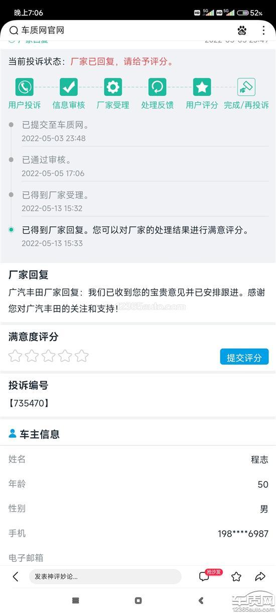 广汽丰田厂家回复:我们已收到您的宝贵意见并已安排跟进。感谢您对广汽丰田的关注和支持!