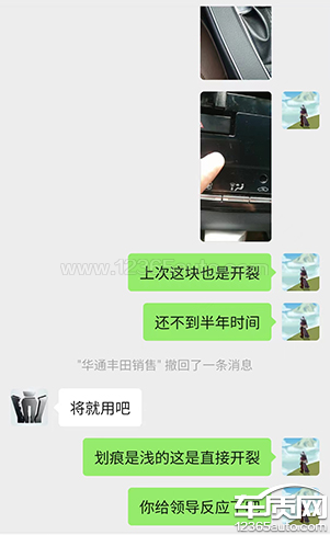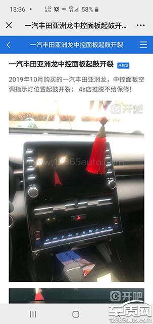 本人于2021年10月30日在西安4S店购买一辆2021款2.5L汽油豪华版轿车,3月18日发现中控双闪按键位置开裂,反映给销售,销售给出的答复是比较脆弱,让我将就开。4月15日,右侧位置发现起鼓开裂,裂痕长度差不多2公分,再次给4S店反映,本人提供网上亚洲龙中控开裂案件,4S店说过来做首保的时候帮看看,我做完首保,4S店在没有技术鉴定的情况下判定是人为现象,现有2处裂痕4S店均判定为人为,此事我反映给4S店无果故反映给厂家,厂家与4S店互相推辞无果,直到5月23日,再次在中控按键位置发现裂痕,4S店再次推辞,并告知与前两次均为人为!故在此做出反应!望平台还消费者一个公道!谢谢!