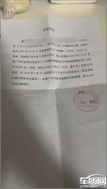 本人在2022年1月提车,在和4s销售沟通后并签署承诺书后说明如广州没有给出相关政策后于3月31号后15个工作日给出相应补贴,然而在4月2号4s店销售说他们4s店原因要5月1号才能给出相关满意答复,到现时为止已经是6月6号了,从微信截图后4月11号,相关4s店销售人员已没有和我联系,所谓的满意答复就是不理不睬,并且没有在相对应时间给出结果,多次忽悠客户。此相关补贴政策涉及到在2021年购车,不能在2021年12月31号前提车的所有消费者,我只是其中之一,请严查,还消费者一个公道。